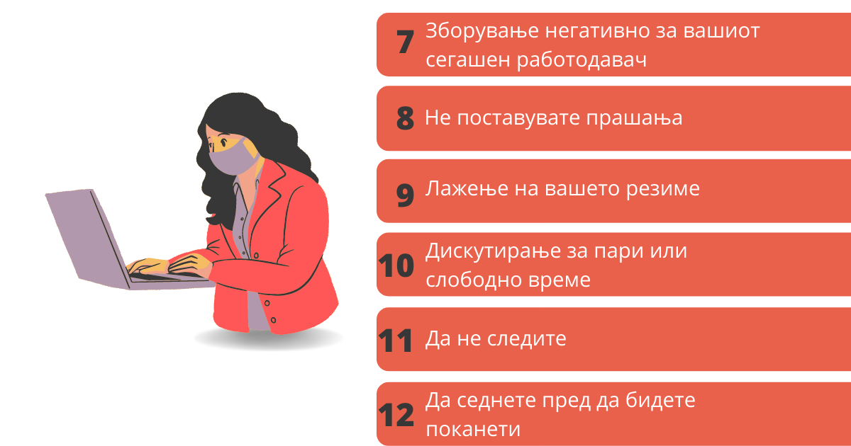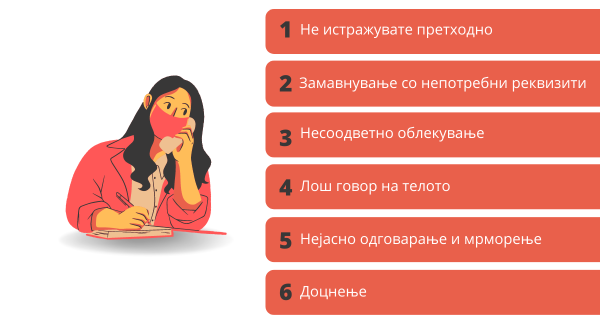 Ако вашето резиме и мотивационо писмо биле доволно импресивни за да добиете интервју, работата би можела да биде ваша - под услов да се покажете добро на интервјуто. Дури и најискусните професионалци може да се збунат и да си ги расипат шансите, па со малку подготовка можете да ги избегнете овие вообичаени грешки на интервјуто: