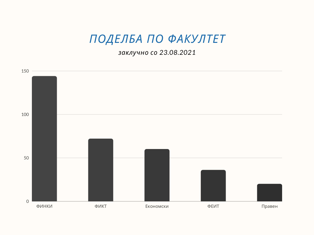 🎓 Кај студентите кои се веќе регистрирани на платформата од околу 900 регистрирани кандидати, процентуално нивната застапеност по факултети изгледа вака: од ФИНКИ бројот на студенти е најзастапен со околу 16% од вкупниот број на регистрирани кандидати, потоа со 8% тука е ФИКТ, потоа следуваат студентите на економските факултети со застапеност од 7%, со самиот пораст на порастот на платформата се очекува промена на овие бројки.